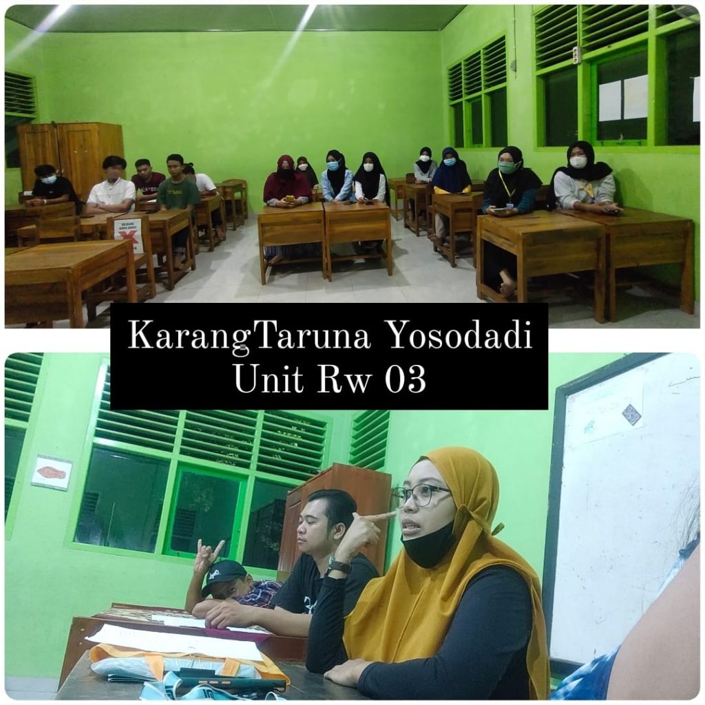 Halo Sahabat Karta, Pada hari Minggu, 6 Febuari 2021 Karang Taruna Yosodadi Unit RW 03 menyelenggarakan kegiatan pembahasan Progja. Diharapkan melalui kegiatan ini Karta Yosodadi Unit RW 03 dapat membuat Progja yang dapat berguna bagi lingkungan sekitar. Salam kesetiakawanan!